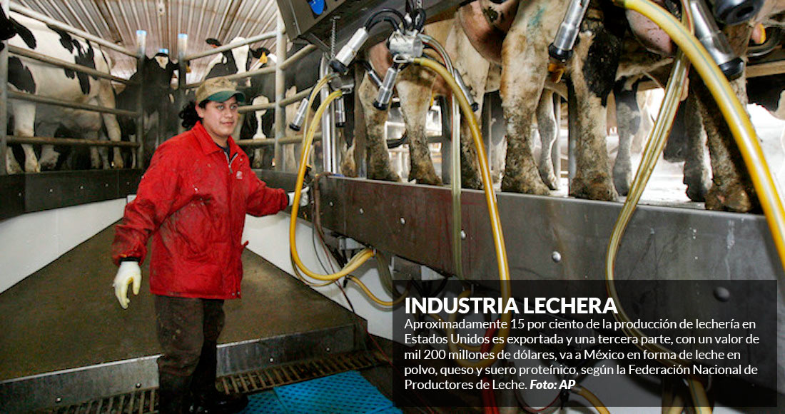 Aproximadamente 15 por ciento de la producción de lechería en Estados Unidos es exportada y una tercera parte, con un valor de mil 200 millones de dólares, va a México en forma de leche en polvo, queso y suero proteínico, según la Federación Nacional de Productores de Leche, la cual dijo que el comercio con México es su principal prioridad. Se trata de casi el doble del valor de lo exportado a Canadá, el segundo mayor mercado de exportación del país, según el Departamento de Agricultura de Estados Unidos.